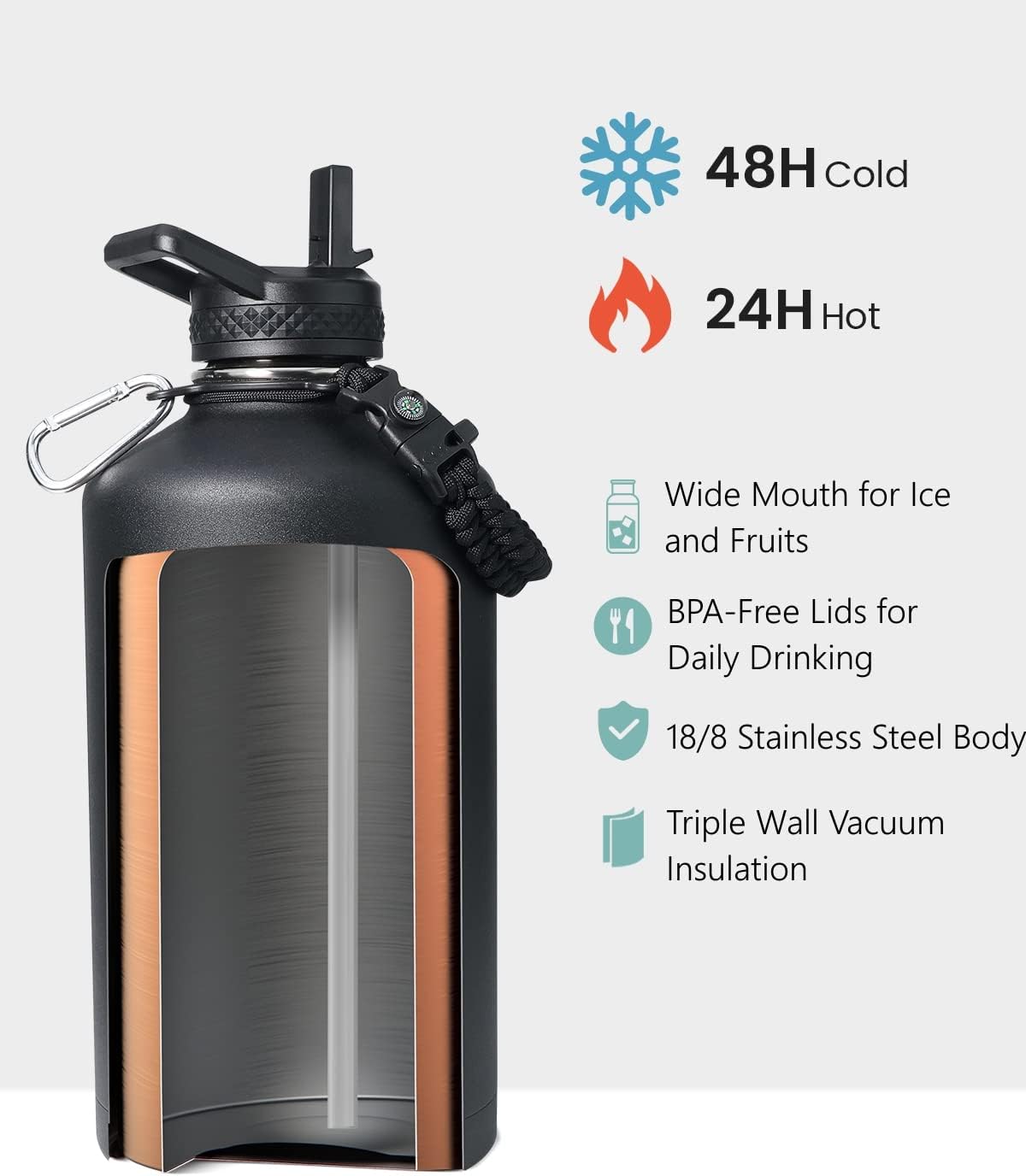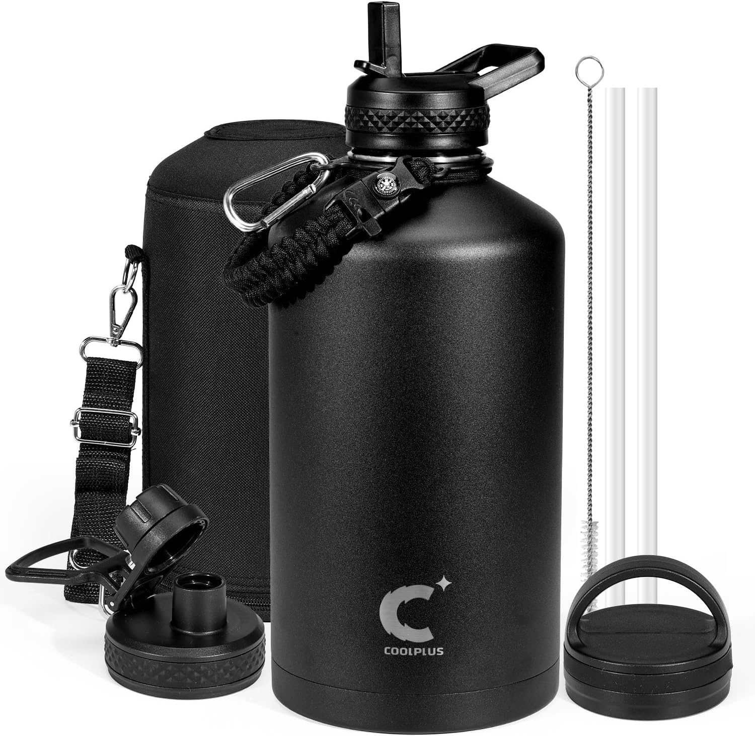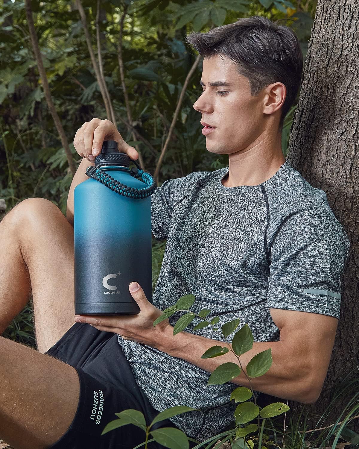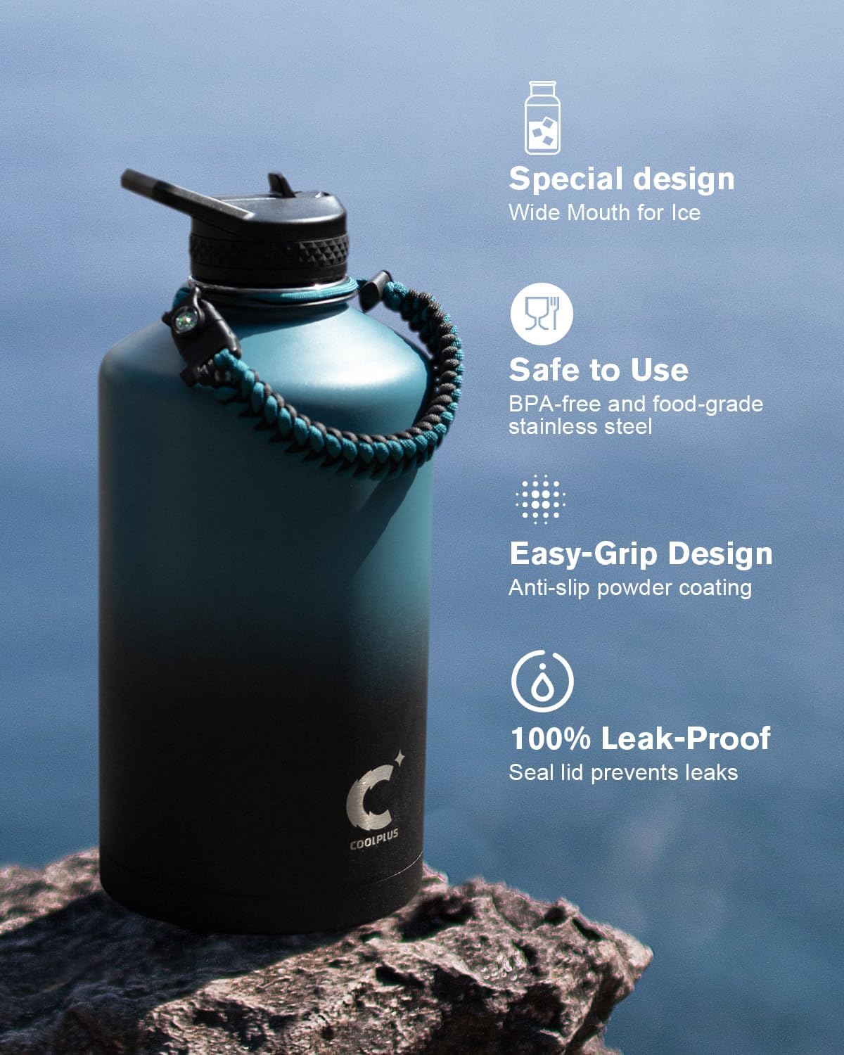 【48 Hrs Cold, 24 Hrs Hot】Coolplus gallon water bottle insulated is vacuum insulated with double wall of 18/8 stainless steel and copper plated interior. This large water bottle can keeps hot or cold for extended period of time, taste a bit of sweet summer in every sip.
